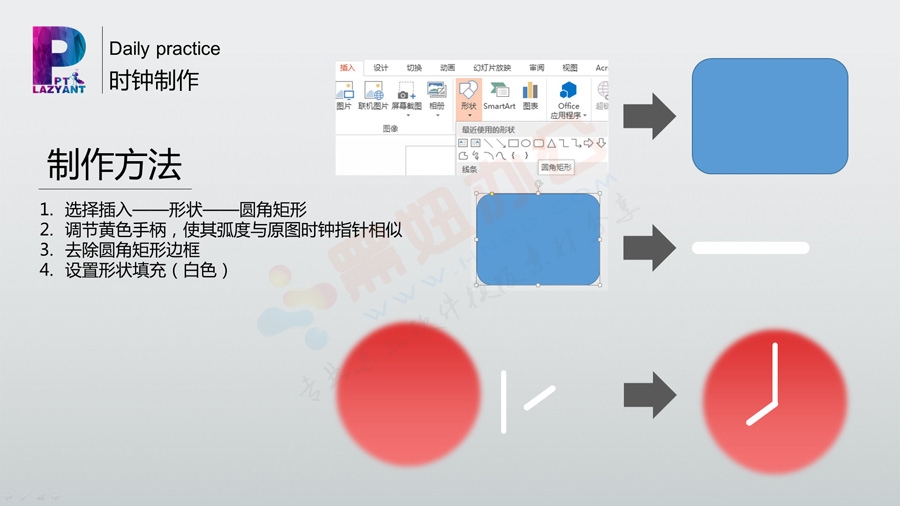 制作方法:(1.选择插入——形状——圆角矩形;2.调节黄色手柄,使其弧度与原图时钟指针相似;3.去除圆角矩形边框;4.设置形状填充(白色))