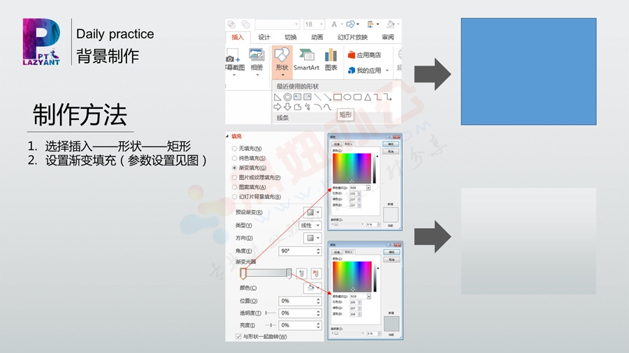 背景制作:制作方法(1.选择插入——形状——矩形 2.设置渐变填充(参数设置见图))