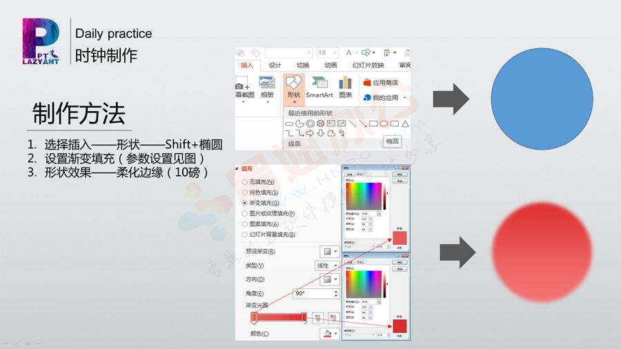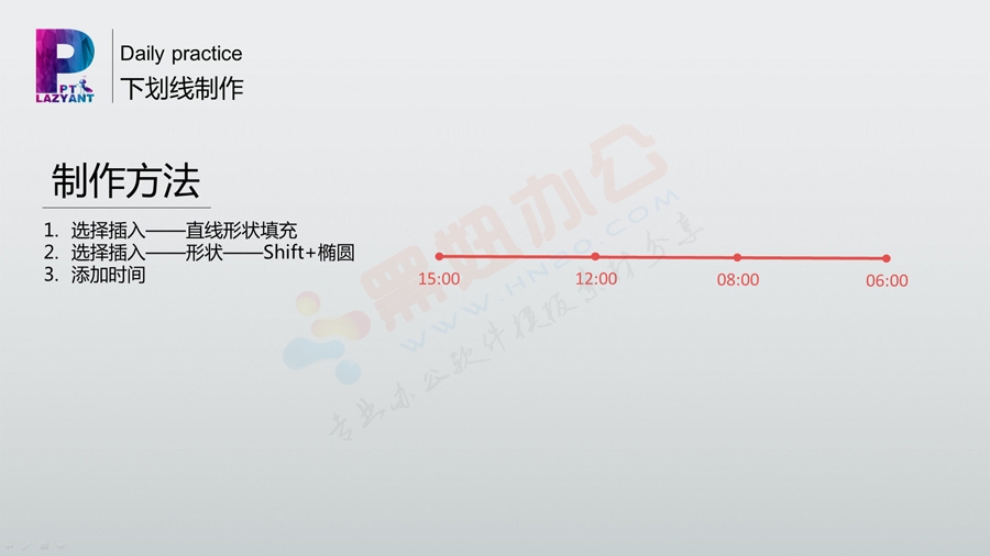 制作方法:(1.选择插入——直线形状填充;2.选择插入——形状——Shift+椭圆;3.添加时间)
