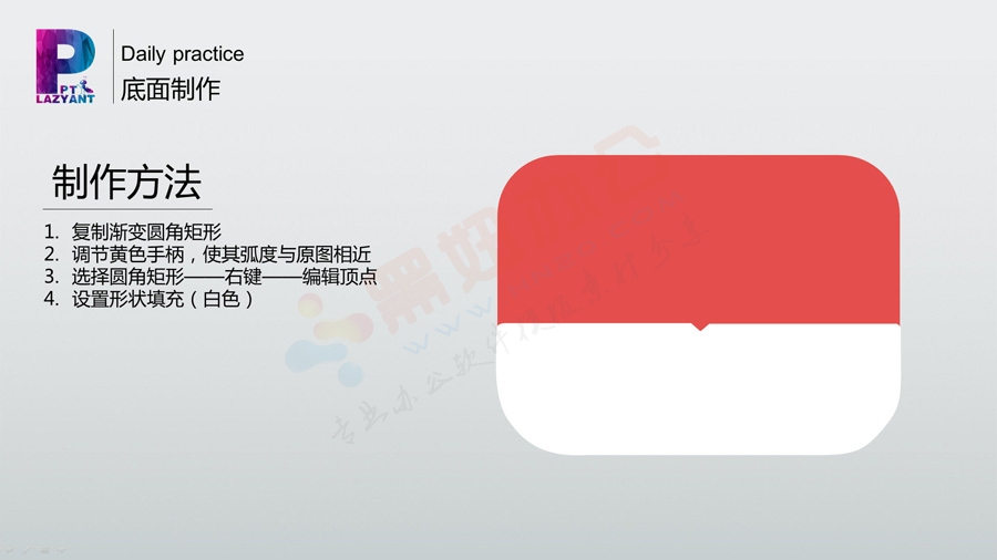 底面制作:制作方法(1.选择插入——形状——圆角矩形;2.调节黄色手柄,使其弧度与原图相近;3.去除圆角矩形边框;4.设置渐变填充(参数设置见图))