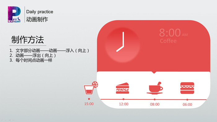 制作方法:食品动画(因动画较为复杂,光靠说明未必可以讲清楚,还需要大家私下潜心研究,源文件稍后放于PPTSTORE网站供大家下载学习。)