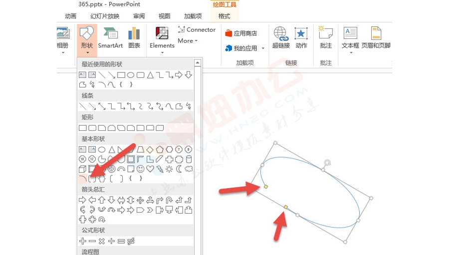 具体操作如下:点击“形状—弧形”,绘制一个椭圆形“轮廓”。利用缺口的黄色调节钮设置到下图是所示。(下图箭头处)