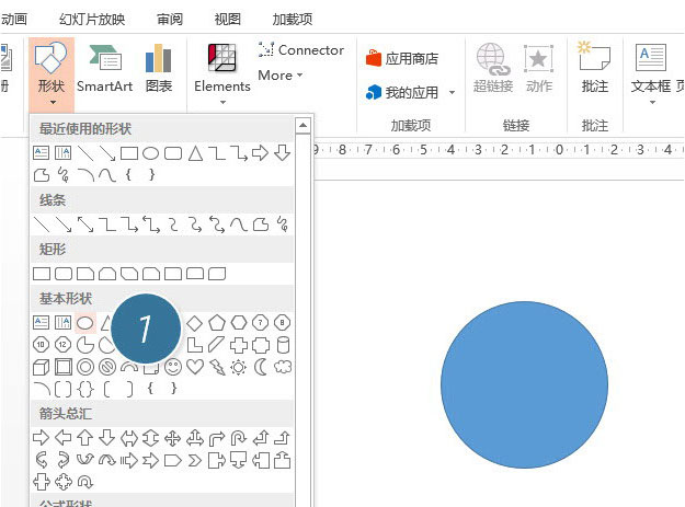 具体操作如下:新建一个幻灯片,在“插入--形状—椭圆”(下图 1 处),按住Shift键拖拽一个正圆。