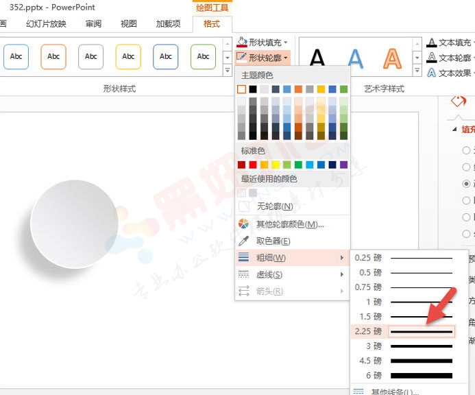 后将圆形轮廓设置为白色即可,这里有个细节,将轮廓线可以设置到2.25磅粗细。(下图箭头处)