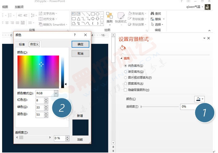 具体操作如下:先设置PPT背景为以下颜色,RGB代码为:8:33:53(下图2处)。在PPT页面鼠标右键背景,即可打开下图页面。
