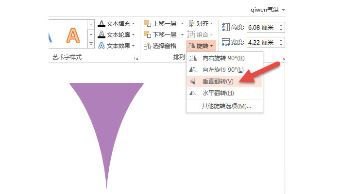 然后复制一个之前做好的弧度三角形,反转成头朝下的状态,点击“旋转—垂直翻转”下图箭头处。