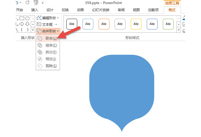 选中半透明椭圆,按住Ctrl+Shift键,再复制拖拽一个椭圆,同样相交到等腰三角形的另外一边,然后同时选中这三个图形,点击“合并形状—拆分”(下图箭头处)效果如下:
