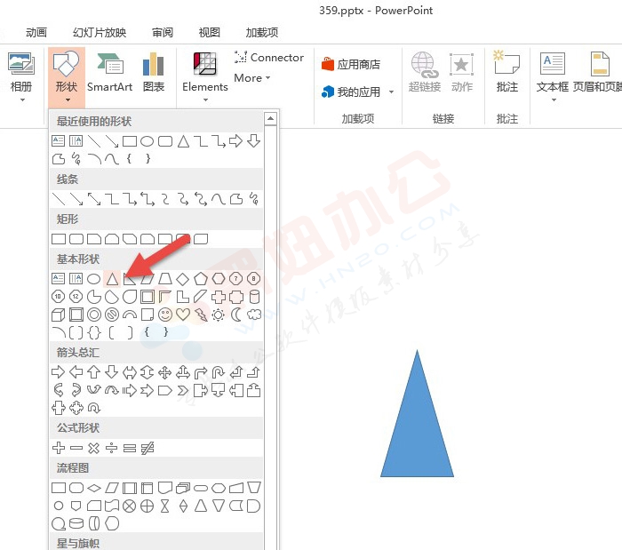 具体操作如下:新建一个PPT,点击“插入-图形-等腰三角形”,绘制一个等腰三角形,不要绘制得太大。(下图箭头处)