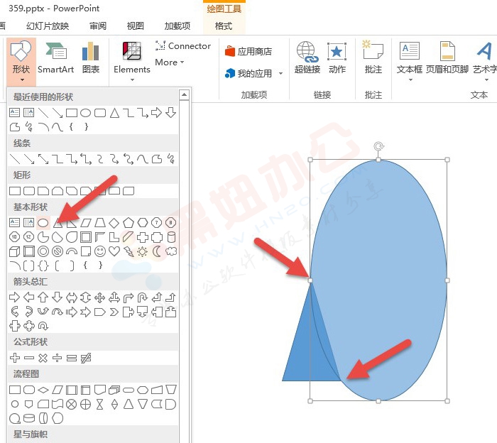 接着插入一个椭圆形,椭圆要足够大,注意椭圆与等腰三角形的“相交”处。(下图箭头处)
