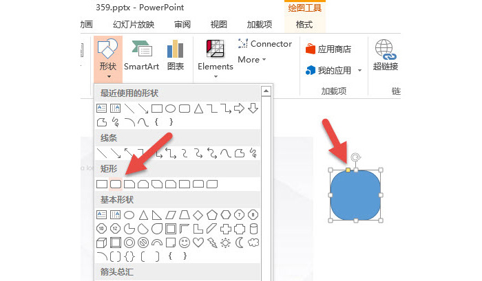 仔细观察你会发现,它是一个“圆角矩形+弧度三角形”组合而成。插入一个圆角矩形,并拖拽黄点到下图箭头所示位置。