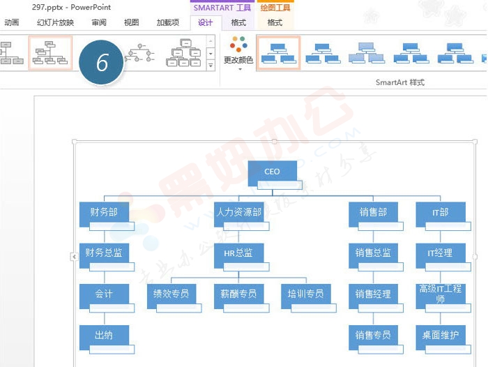 但似乎还不那么满意,比如第四层级,为什么连接线是歪的?,有比如“秘书”怎么放进去呢?首先来解决连接线的问题?一种方法是换一种组织架构图的表达。在SmartArt工具栏中选择下图6处的组织架构图类型。