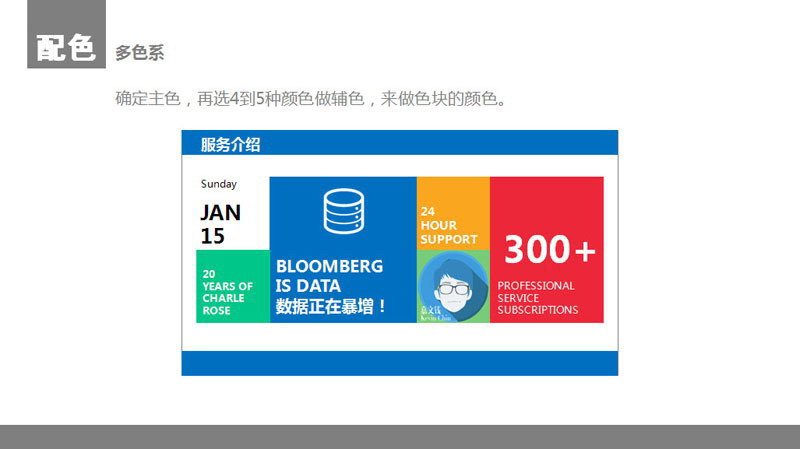 PPT多色系配色:确定主色,再选4到5种颜色做辅色,来做色块的颜色。